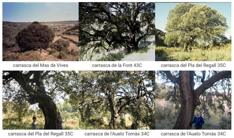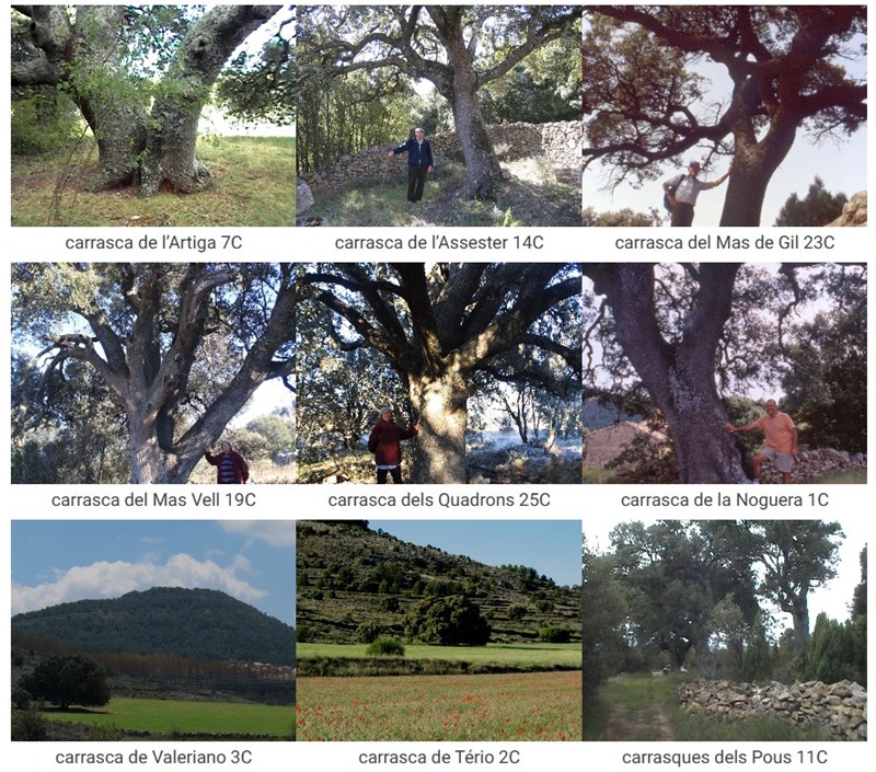 Basilio Peris del Mas de Collet, Otílio Solsona del Mas de Capote i Encarna Gual del Mas de Trigos, com a informants nostres, acompanyen algunes imatges; també l’amic Ferran Guardiola Noguera va voler retratar-se amb un arbre de bateig semblant. Fixem-nos que algunes carrasques, sense ser monumentals, es guanyen el nom per la funció (assester) o la singularitat (créixer entre roques).