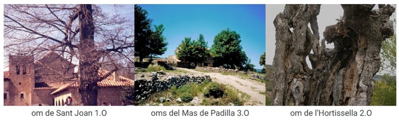 L’om de Sant Joan ja no hi és, però el seu nom es recorda perquè en va presidir molts anys l’entrada. Els oms del Mas de Padilla, en fer les primeres enquestes de Vistabella (1999) encara hi eren ben ufanosos; avui potser ja han perperit… la grafiosi. L’om de l’Hortissella (també a la portada), potser un dels arbres més significatius d’aquests pobles; tot i haver mort, ha esdevingut escultura majestuosa del pati de l’ermita. Al si de la soca, diuen, jugaven assegudes quatre persones a la baralla.
