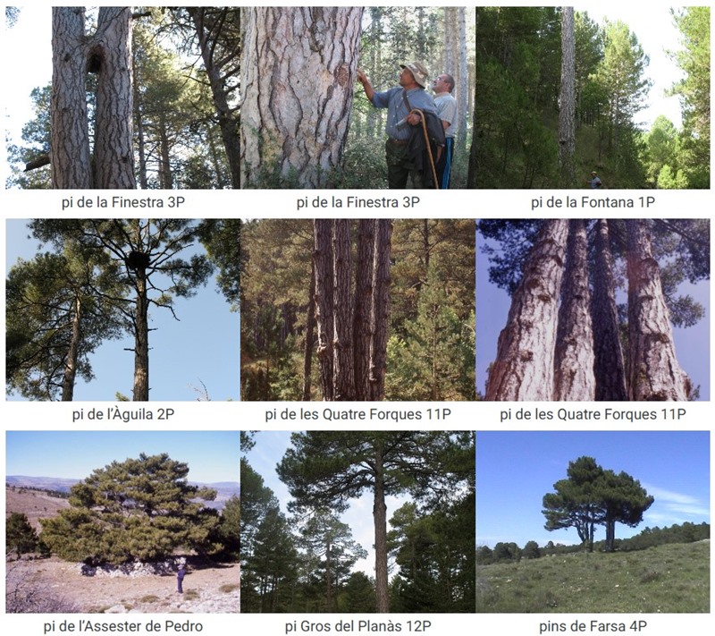 Són molts els pins de Vistabella que mereixen ser retratats. El pi de la Finestra mostra la forma de l’emparellament de dos pins nascuts ben junts i amb una soca ampla com ens mostren Antonio Gargallo Navarrete, del mas de Trigos, i Odiló Garcia de la Ribagrossa. El mateix Antonio ens assenyalava uns dels altíssims pins de la Fontana i el pi de l’Àguila. A Raimundo del Carrascal el trobem vora el pi de l’Assester de Pedro (9P). Al pdf trobareu una altra imatge del pi de les Quatre Forques i els diversos ‘pi Gros…’, com aquest del Planàs, amb Josep Miquel Ribés acompanyant-nos en l’excursió.