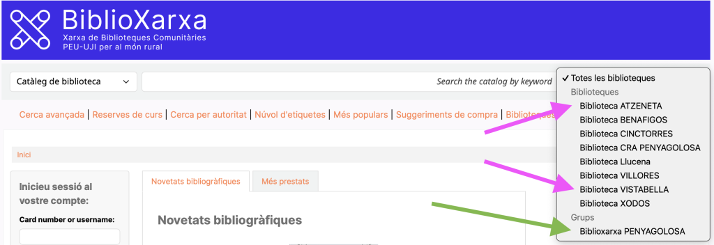 Si cliqueu al desplegable “Totes les biblioteques” podeu vore de manera separada els llibres que ja tenim catalogats a Atzeneta o a Vistabella, per exemple. Però si cliqueu sobre Biblioxarxa Penyagolosa trobareu el còmput total: els quasi 5000 llibres que tenim fitxats i que podeu demanar.