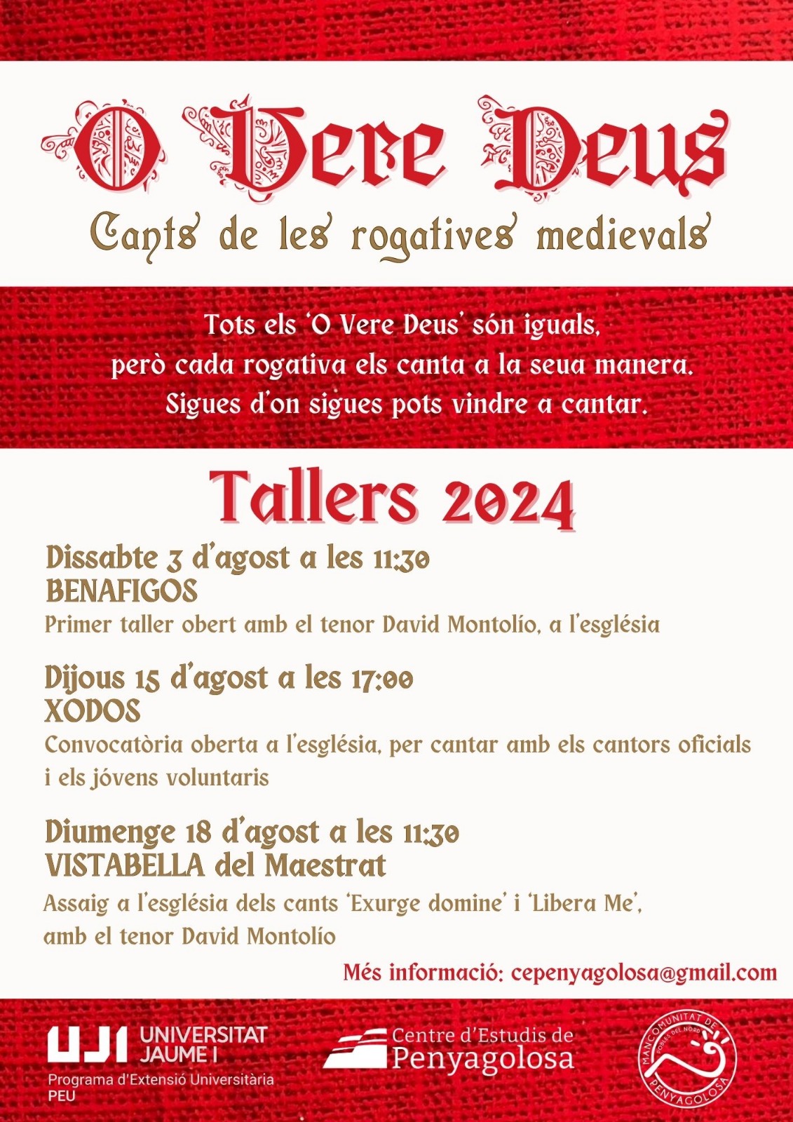 Enguany Benafigos se suma al projecte que tenim encetat per a recuperar els cants medievals de les rogatives que encara es fan al nostre territori. Miguel Ángel Martí ha realitzat la feina d’investigació i ha pogut ajuntar dones majors que encara saben cantar l’O Vere Deus; a partir de les gravacions s’han pogut fer convocatòries d’assajos, i es fa una crida oberta per a participar el 3 d’agost en el taller que dirigirà el tenor David Montolío.