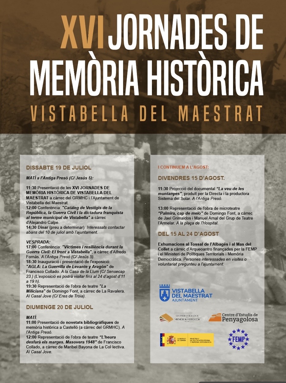 Les XVI Jornades de Memòria Històrica de Vistabella del Maestrat estan programades per als dies 19 i 20 de juliol, i per al 15 d’agost. Ofereixen conferències, representacions teatrals, presentacions de novetats editorials, una exposició i la projecció del documental “La Veu de les Muntanyes”.